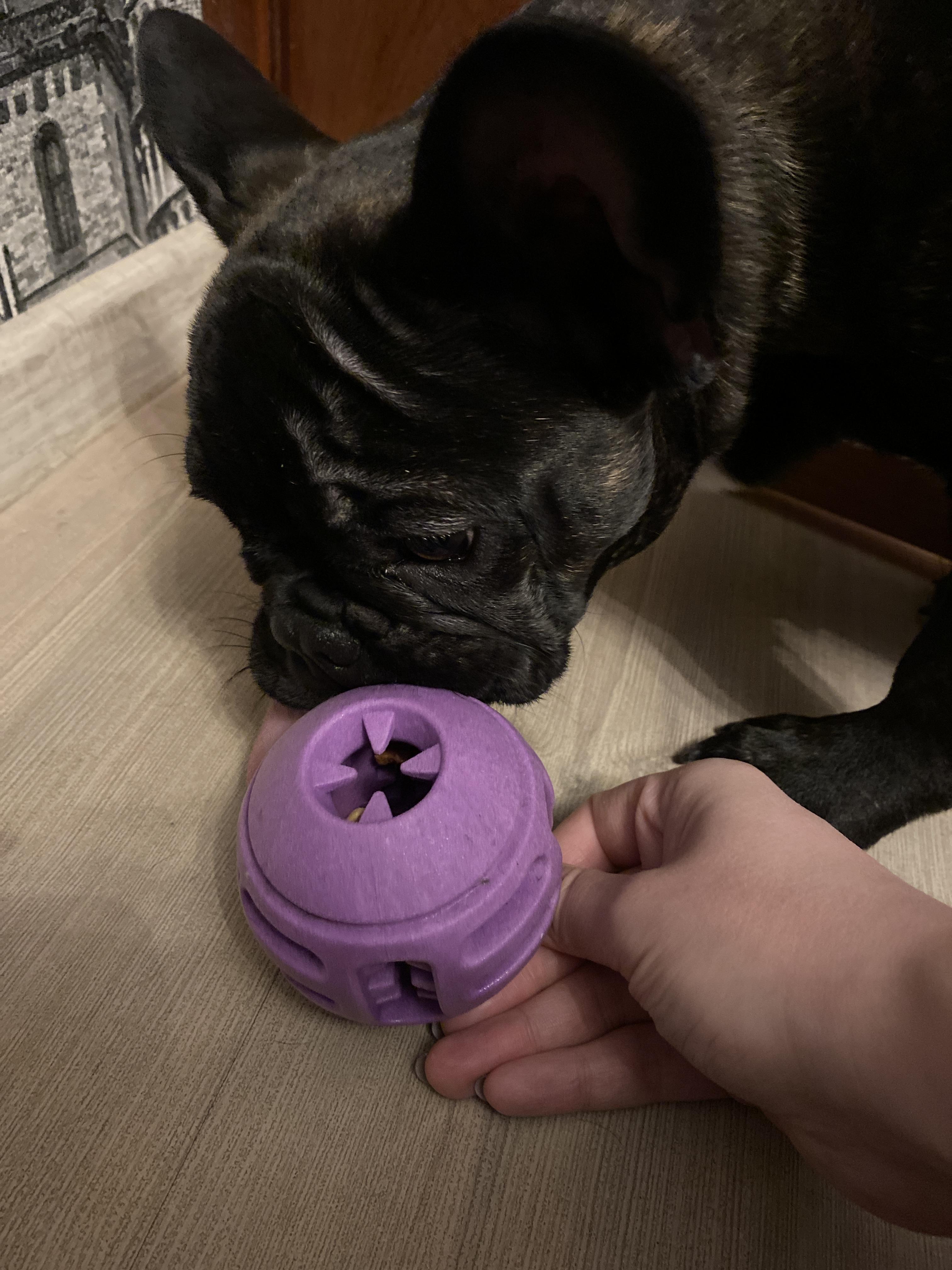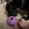 Мяч крупный, имеет стойкий приятный запах винограда. Отверстия позволяют "прятать" самые разные вкусняшки. Щенок в восторге, очень любит с этим мячом играть.